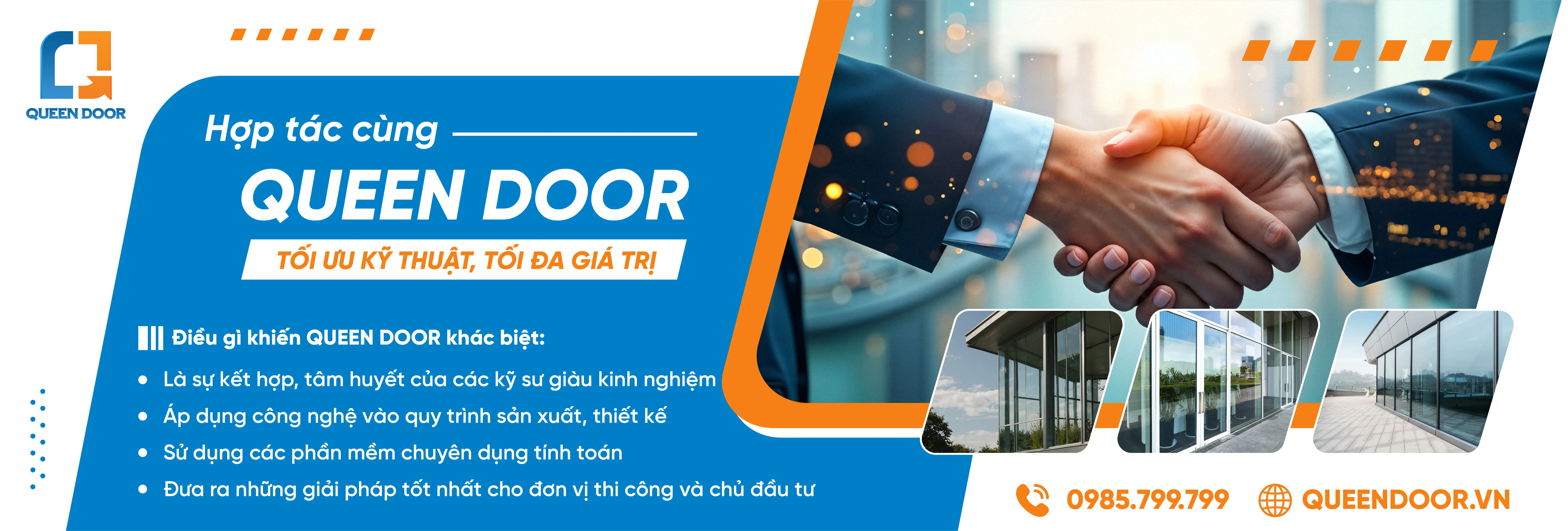 Queendoor là thương hiệu thuộc Minh Đức Group, hệ sinh thái doanh nghiệp hoạt động trong lĩnh vực sản xuất – thương mại – phân phối, với các thương hiệu đã vận hành ổn định như QueenCrown, KingEdo và các đơn vị thành viên khác, tạo nền tảng tài chính rõ ràng, quản trị bài bản và năng lực sản xuất – hậu mãi dài hạn. Với Queendoor, cửa nhôm không chỉ là hình thức bên ngoài mà là giải pháp tổng thể: thiết kế đúng ngay từ đầu, gia công chuẩn, thi công chính xác và chịu trách nhiệm đến cùng. Chúng tôi không chạy theo số lượng, mà chọn làm ít hơn nhưng làm đúng, để mỗi công trình bàn giao đều đạt yêu cầu về thẩm mỹ, độ bền và giá trị sử dụng lâu dài. Uy tín của Queendoor nằm ở những bộ cửa đã lắp và đang vận hành mỗi ngày.